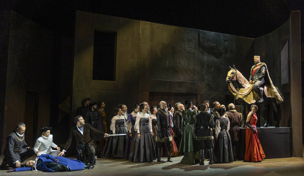 E così lo scenografo Guido Buganza colloca l’opera su un dispositivo girevole dal design sobrio ma fatto di quinte scorrevoli, passaggi segreti, porte a scomparsa. Proseguendo nelle note di regia, Rifici spiega che “Questo eterno movimento, questa forza inarrestabile, così sottilmente amplificata da un coro tragico che accompagna sentimentalmente la tragedia fino alle sue nefaste conseguenze, mi ha fatto immaginare uno spazio scenico minaccioso e tumultuoso, che impedisce ai personaggi di trovare protezione o conforto”.