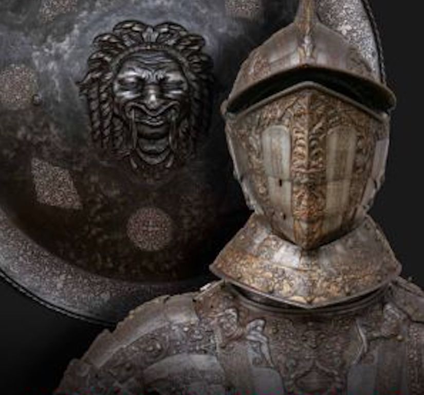 L’altra sezione di “Armi e potere nell’Europa del Rinascimento” è ambientata nelle sale di Castel Sant’Angelo, che dall’alto delle sue mura offre un magico colpo d’occhio sulla Capitale. In mostra pezzi provenienti dall’Europa Occidentale, ma anche dalla Turchia e dall’Oriente. E qui si ammira un’altra parte della Collezione Odescalchi proveniente dal Palazzo di Piazza Santi Apostoli. Elmetti a visiera. Armature rispondenti ad un apparato multiforme. Celate decoratissime. Per giungere ai resti di una copertura da cavallo di Cosimo I de’ Medici e alla sua lancia. Esposto pure un ritratto di Siciolante Girolamo da Sermoneta che raffigura Francesco II Colonna in armatura di guerra (1561).