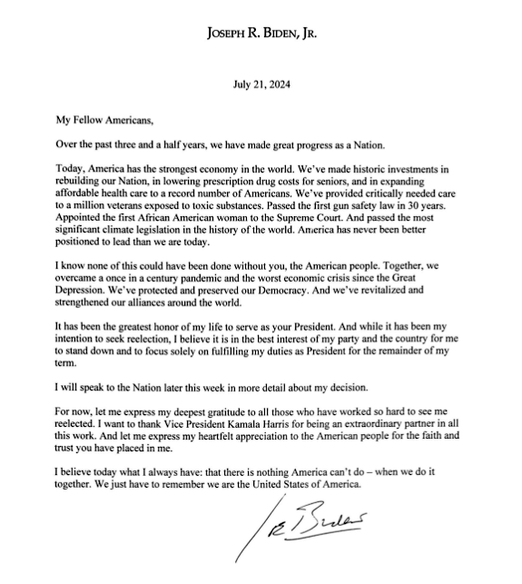 “Miei concittadini, negli ultimi tre anni e mezzo abbiamo compiuto grandi progressi come nazione. Oggi l’America ha l’economia più forte del mondo”, scrive il presidente Biden elencando tutto ciò che è stato fatto durante il suo mandato. “Abbiamo fatto investimenti storici per ricostruire la nostra nazione, per ridurre i costi dei farmaci da prescrizione per gli anziani e per espandere l’assistenza sanitaria a prezzi accessibili a un numero record di americani. Abbiamo fornito le cure necessarie a un milione di veterani esposti a sostanze tossiche. Abbiamo approvato la prima legge sulla sicurezza delle armi in 30 anni. Abbiamo nominato la prima donna afroamericana alla Corte Suprema e approvato la più significativa legislazione sul clima nella storia del mondo. L’America non ha mai avuto una tale posizione da leader”.