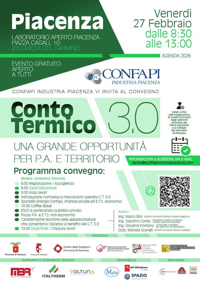 “Conto Termico 3.0”: è il titolo del convegno che si tiene domani, venerdì 27 febbraio, presso il Laboratorio Aperto dell’ex chiesa del Carmine a Piacenza. L’importante iniziativa, promossa da Confapi Industria Piacenza, mira a illustrare le nuove opportunità della transizione ecologica a professionisti, imprese e pubbliche amministrazioni, analizzando i meccanismi operativi di un settore in costante evoluzione.