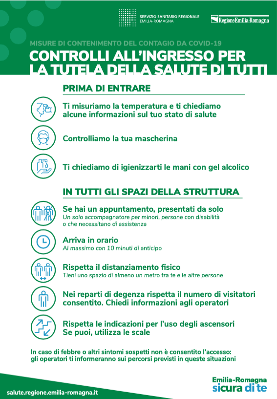 Segnaletica, manifesti e vetrofanie, spiega una nota della Regione Emilia-Romagna, sono a disposizione di tutte le aziende sanitarie con le indicazioni per gli utenti. Dall’indossare la mascherina al dover igienizzare le mani con gel alcolico; dal rispetto del distanziamento fisico al presentarsi puntuali, né prima né dopo, in caso di appuntamento; dal numero massimo di visitatori consentito nei reparti degenza, così come di chi accede agli ascensori (se si è in condizione, meglio fare le scale). Fino alla temperatura presa all’ingresso, oltre ad alcune informazioni richieste dagli operatori sullo stato di salute.