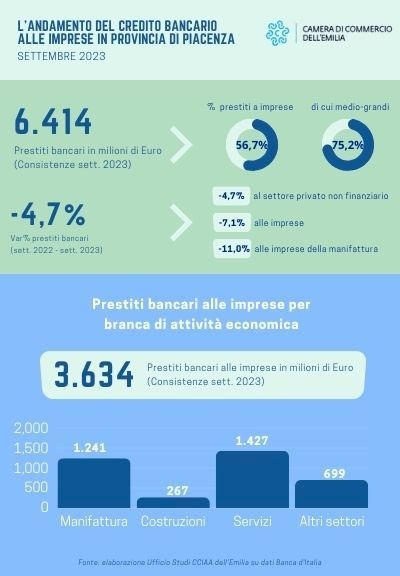 Il credito a Piacenza: i prestiti erogati dal sistema bancario in provincia a fine settembre 2023 sono risultati in calo del 4,7% rispetto allo stesso periodo dello scorso anno; gli impieghi si sono così portati a 6,4 miliardi di euro.