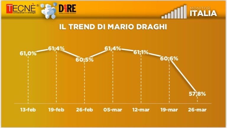 Dal 13 febbraio, giorno del suo insediamento, il premier Draghi ha visto calare il suo consenso di circa 3,2 punti di percentuale, che diventano 3,6 se si considera il 19 febbraio, giorno in cui i giudizi positivi nei suoi confronti hanno raggiunto l’apice.
