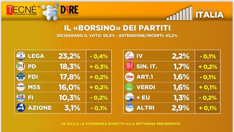 La Lega intanto si conferma primo partito in Italia con il 23,2% dei consensi ma perde lo 0,4%. Guadagna invece il Pd (+0,3%) che tiene a distanza Fdi. Il partito di Giorgia Meloni guadagna comunque uno 0,2%. Questa quindi la classifica della settimana: Lega al comando con il 23,2%, segue il Pd con il 18,3% e chiude il podio Fdi con il 17,8%. Guadagna il il M5S (+0,2%), quarto con 16%. Quindi Forza Italia al 10,3% (-0,1%). Seguono Azione 3,1% (-0,1%), Italia Viva 2,2% (-0,1%), Sinistra italiana 1,7% (+0,2%). Quindi Art.1 (-0,1%), Verdi (+0,1%) e +Europa (-0,2%) e Sinistra a 1,5%.