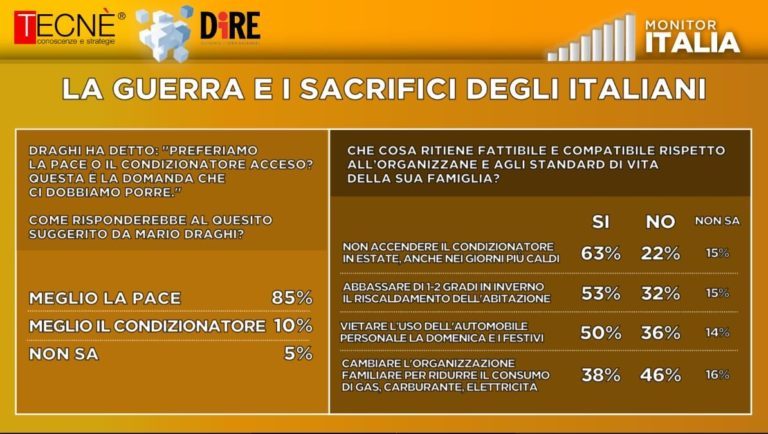 Di fronte alla provocazione di Draghi gli italiani hanno pochi dubbi: l’85% preferisce la pace all’aria fresca. Il 10% vuole invece il condizionatore acceso e il 5% non sa. È quanto emerge dal sondaggio dell’Agenzia Dire realizzato con Tecnè l’8 aprile su un campione di mille persone.