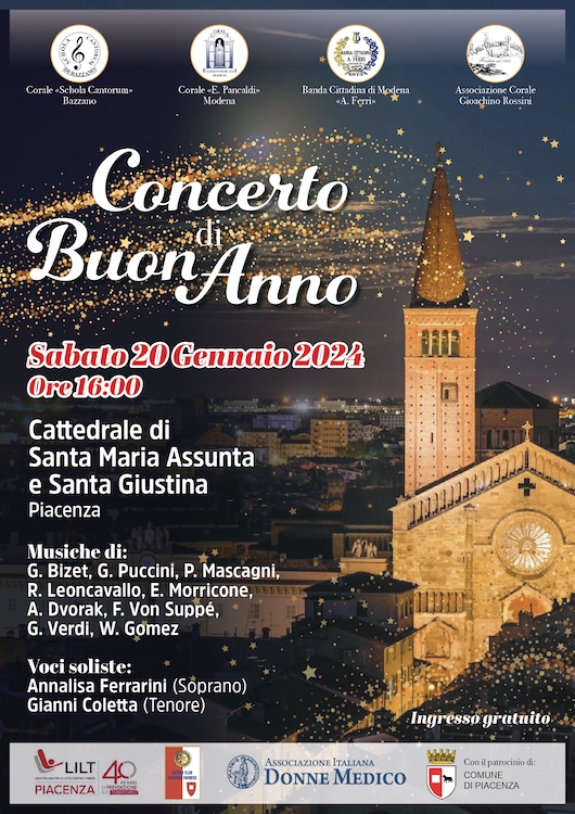 Duomo di Piacenza: dopo la straordinaria accoglienza dello scorso anno, viene riproposto il concerto di Buon Anno. L’appuntamento ad ingresso gratuito è per sabato 20 gennaio alle ore 16. Promotori dell’evento sono la Lilt piacentina (Lega Italiana per la Lotta contro i Tumori), il Rotary Farnese, con il sostegno dell’Associazione italiana donne medico. Tutte realtà associative impegnate per il bene della città e dei suoi abitanti, convinte che l’augurio per un anno di serenità e benessere passi anche attraverso la bellezza dell’arte e della musica.