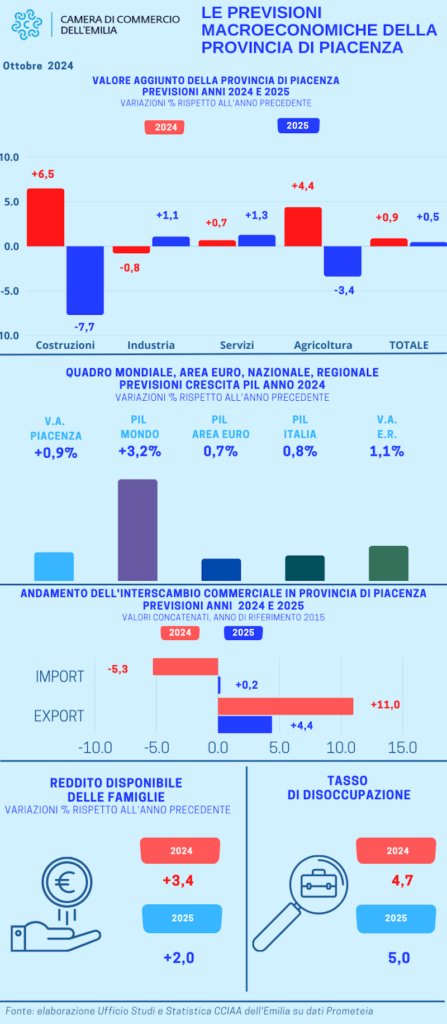 Economia piacentina: il bilancio a fine 2024 sarà positivo, seppure con previsioni di lieve rallentamento. Lo dicono le ultime analisi della Camera di commercio dell’Emilia, basate sui dati degli Scenari di previsione dell’Osservatorio Prometeia. Infatti, prevedono a fine 2024 un Pil in crescita dello 0,9%, ma in frenata rispetto al +1,2% previsto a luglio scorso. Per il 2025 è atteso invece un ulteriore incremento dello 0,5%.
