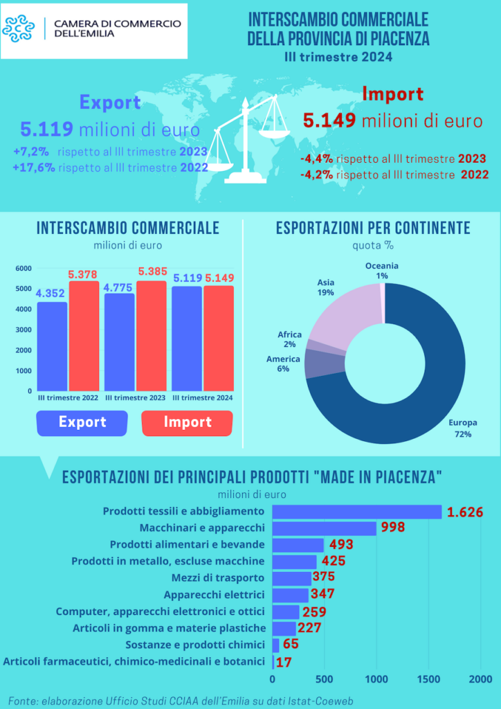 Guardando ai diversi settori produttivi delle esportazioni piacentine, tra i comparti che hanno maggiormente contribuito all’aumento del trend nei primi nove mesi del 2024 spicca il tessile abbigliamento (che come altri comparti si appoggia ai magazzini della logistica e fa dogana a Piacenza, ndr): con un incremento del 13,6%, ha portato il valore delle esportazioni a 1,626 miliardi, aggiungendo 194 milioni ai risultati del settembre 2023. Rilevante l’aumento delle esportazioni di prodotti alimentari e bevande; la crescita, in questo caso, è stata del 6,6%, vale a dire 30 milioni in più rispetto al settembre 2023, per un totale salito a 493 milioni di euro.