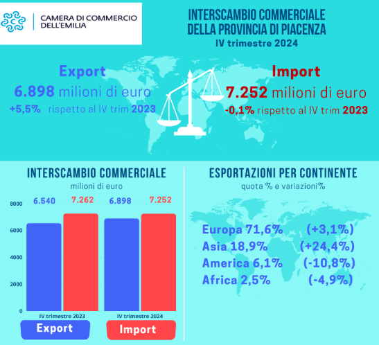 L’export piacentino sfiora i 6,9 miliardi di euro con una crescita del 5,5%. Le elaborazioni sul 4° trimestre 2024 dell’Ufficio studi della Camera di commercio dell’Emilia su dati Istat evidenziano soprattutto i buoni risultati della manifattura nel suo complesso con un incremento del 5,1%, rispetto allo stesso periodo del 2023.
