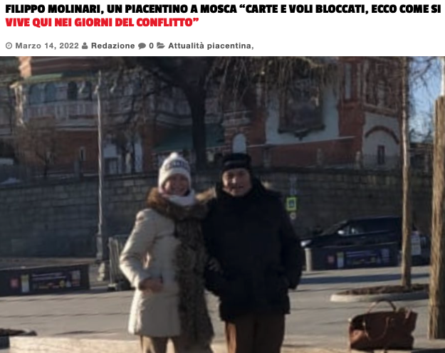 Filippo Molinari, piacentino, si trova a Mosca. È in Russia dai primi di febbraio per motivi di lavoro e per far visita ai suoceri. Con lui ci sono anche la moglie Elena Mitrofanova, di origini russe ma piacentina di adozione, e il figlio di 8 anni, Lev Alexander.
