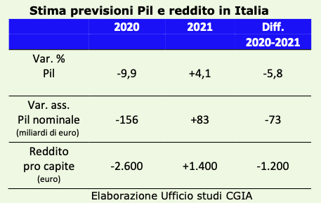 “A livello pro capite stimiamo che l’anno scorso ogni italiano abbia perso mediamente 2.600 euro di reddito, mentre quest’anno ne riguadagnerà poco meno di 1.400 euro”, afferma il coordinatore dell’Ufficio studi dell’associazione veneta Paolo Zabeo. “Nel biennio 2020-2021, pertanto, il saldo sarà negativo e pari a poco più di 1.200 euro. Quest’anno, quindi, assisteremo a un rimbalzo della nostra economia che ci farà recuperare solo una parte della contrazione registrata nel 2020”.