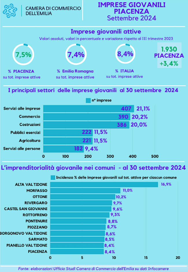 Le imprese giovanili a Piacenza e provincia sono 1.930. Il dato è riferito al 30 settembre 2024 ed emerge dalle analisi dell’Ufficio studi della Camera di Commercio dell’Emilia, che evidenziano una crescita del 3,4% rispetto allo stesso periodo del 2023. L’incidenza delle imprese guidate da under 35 è pari al 7,5% sul totale delle imprese attive sul territorio provinciale, un dato lievemente superiore a quello regionale (7,4%).
