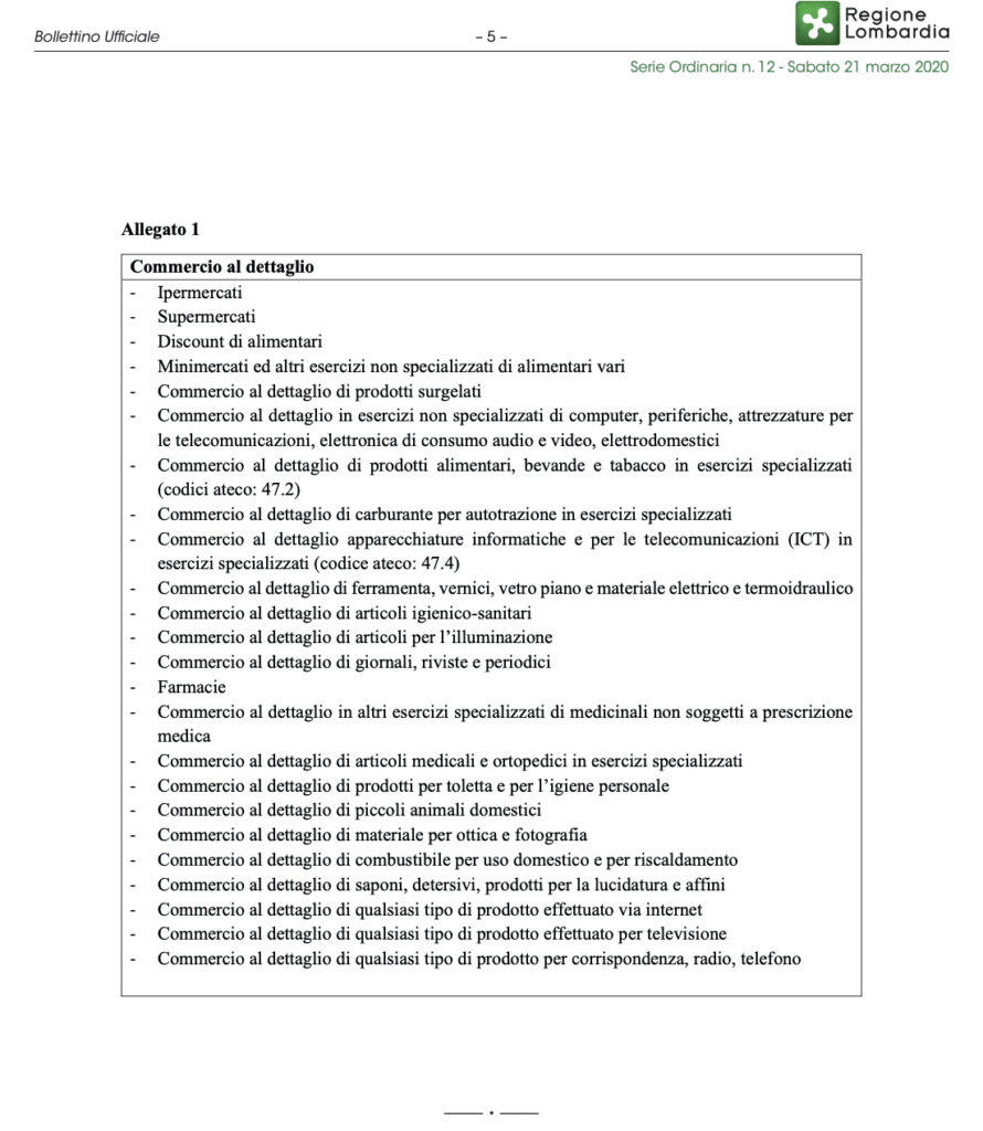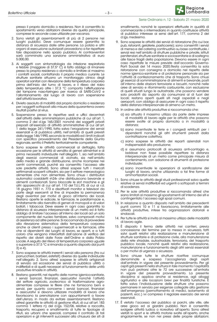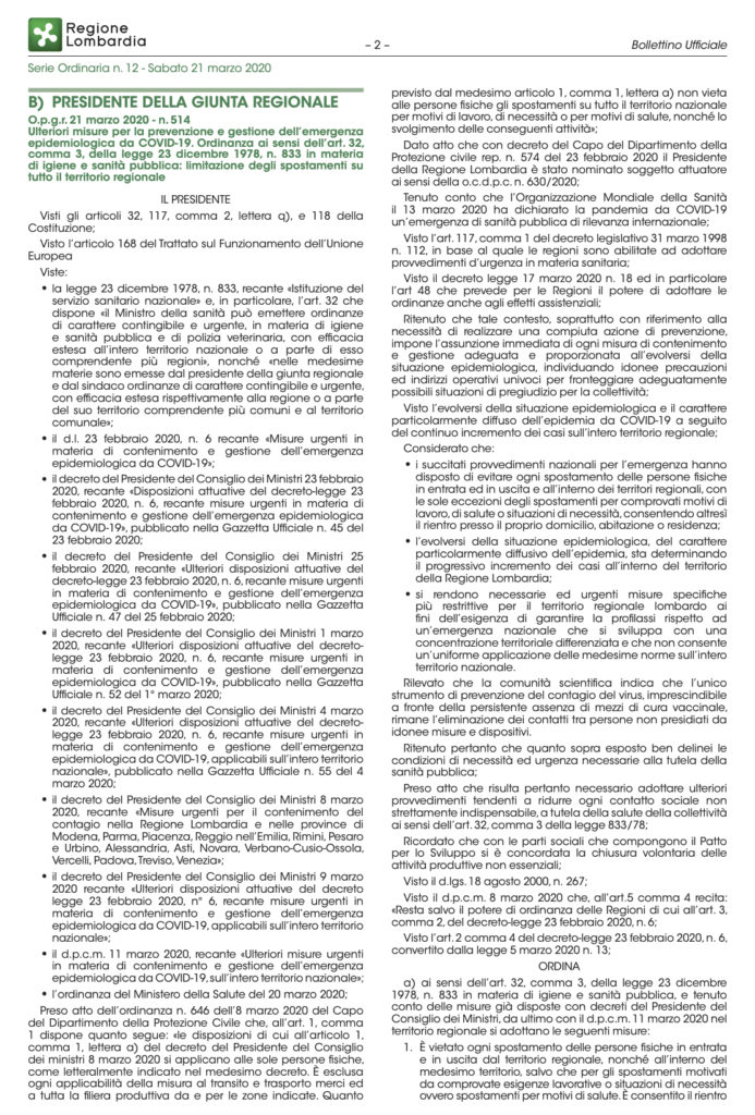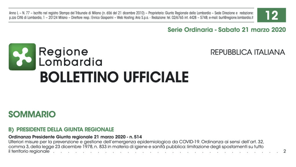 Lombardia: l’Ordinanza 514 stabilisce regole più severe per contenere il contagio del coronavirus. Tra queste restrizioni, valide senza eccezioni in tutta la regione fino al 15 aprile, la sospensione dell’attività di uffici pubblici e studi professionali; il blocco delle attività nei cantieri; il divieto di praticare sport e attività motorie all’aperto, anche da soli.