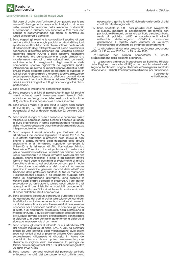 Ecco testo e allegati dell’Ordinanza 514 del governatore della Lombardia Attilio Fontana in vigore da oggi.