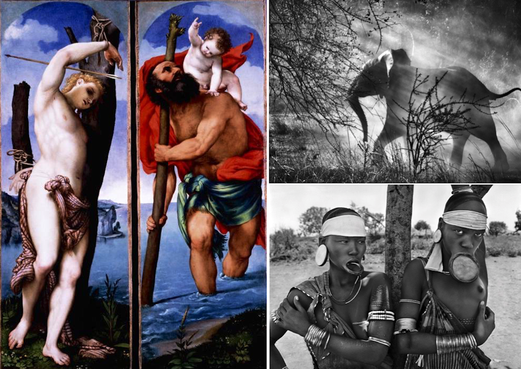 Da sinistra in senso orario: San Sebastiano e San Cristoforo (Lorenzo Lotto, 1538/39, Berlino, Staatliche Museen su Berlin, Gemäldegalerie); Kafue National Park, Zambia, 2010, Etiopia, 2007 (© Sebastião Salgado/Amazonas Images/Contrasto)