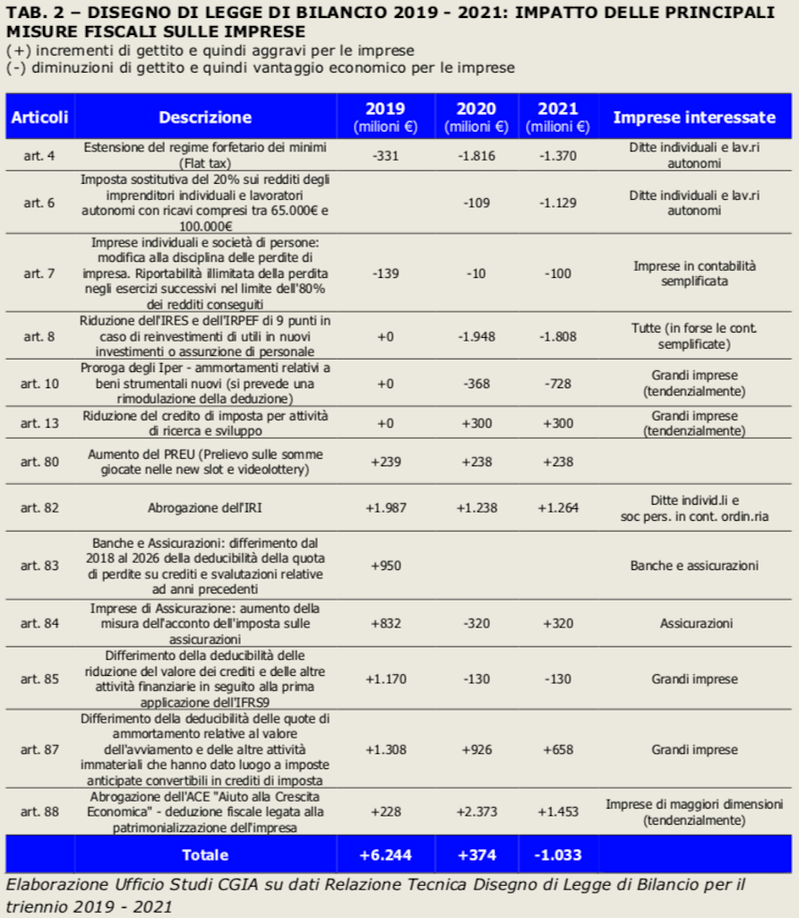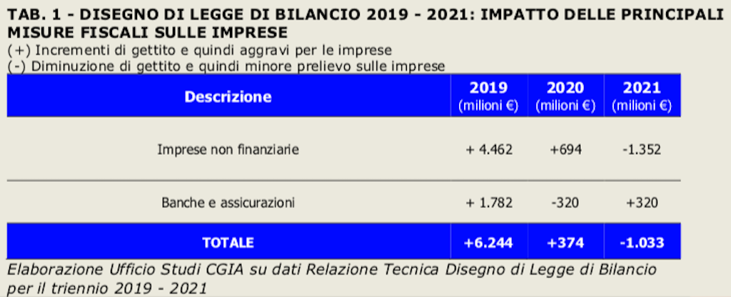 A fare i conti su quella che per il mondo delle imprese sembra una manovra tutt’altro che espansiva, è la Cgia di Mestre, che ha messo in fila le misure previste nella Finanziaria. Da quelle che appesantiranno la tassazione alle misure che sono state rimosse o differite. Senza dimenticare le novità che invece alleggerirano il prelievo. Risultato: nel 2019 le imprese affronteranno un aggravio di gettito di circa 4,5 miliardi di euro. Mentre per le banche e le assicurazioni si arriverà a quasi 1,8 miliardi. Totale: oltre 6,2 miliardi.