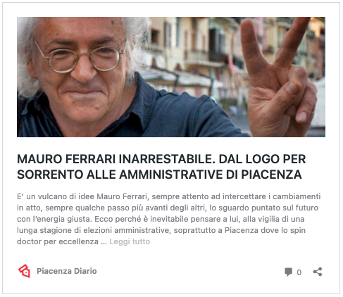 Naturale quindi pensare a Ferrari anche per la campagna elettorale che nella primavera del prossimo anno vedrà la corsa al rinnovo dell’Amministrazione comunale di Piacenza retta dalla sindaca Patrizia Barbieri. Chi lo sta ingaggiando questa volta, il centrosinistra o il centrodestra? Lui ammette dei contatti e nella bella intervista firmata da Mirella Molinari su Piacenza Diario Ferrari elenca gli ingredienti chiave della ricetta per cucinare una vittoria elettorale coi fiocchi…