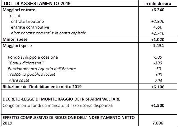 Dal lato delle spese, “l’assestamento alloca maggiori risorse (1,15 miliardi) per finanziare l’integrazione del Fondo sviluppo e coesione, il finanziamento del TPL per 300 milioni, l’integrazione delle risorse per la misura ‘Card diciottenni’ e per il funzionamento dell’Agenzia dell’entrate. Ulteriori risorse, per complessivi 204 milioni di euro netti, sono associate al Fondo politiche sociali, al funzionamento delle Università e al Fondo per il diritto allo studio”.