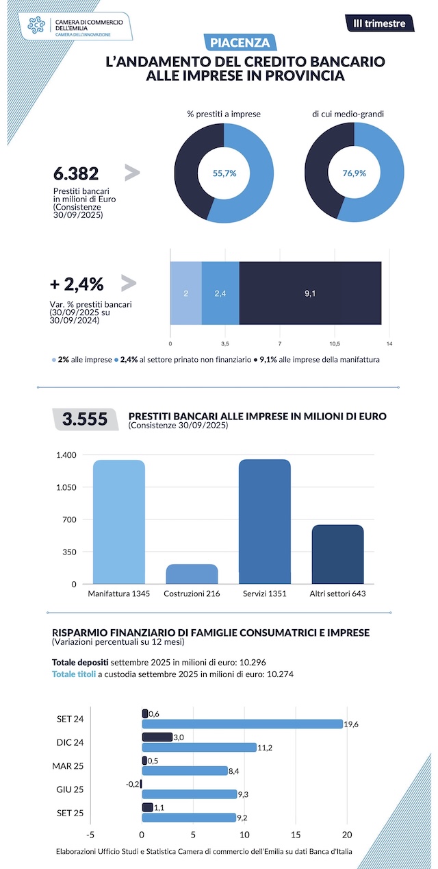 In provincia di Piacenza i prestiti erogati dal sistema del credito a fine settembre hanno registrato infatti un aumento del 2,4% rispetto allo stesso periodo del 2024; gli impieghi bancari hanno così raggiunto i 6,3 miliardi di euro. La crescita ha interessato in particolare le imprese (+2%) e le famiglie consumatrici (+3%). Di segno opposto l’andamento delle pubbliche amministrazioni (-3,8%).