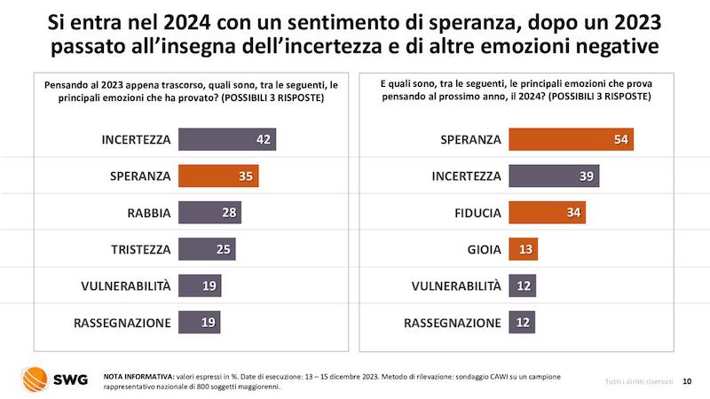 Dal sondaggio Swg emergono anche gli aspetti emotivi con cui si affronta il 2024: nutre speranza, il 54% degli italiani; mentre pensando all’anno passato, prevaleva l’incertezza (42%). Altro dato interessante e positivo, è quello sulla fiducia nel nuovo anno che è stata indicata dal 34% degli intervistati.