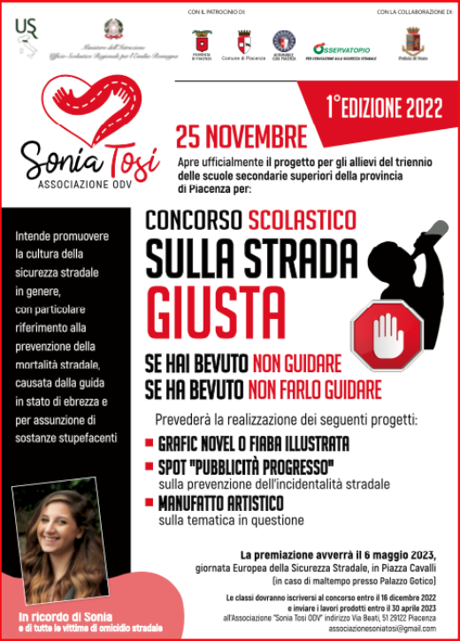 “Sulla strada giusta” è il titolo del concorso scolastico indetto dall’Associazione Sonia Tosi. Un’iniziativa nata per avvicinare i giovani ai temi della sicurezza stradale, rivolta agli allievi del triennio delle Scuole secondarie superiori di tutto il territorio piacentino, con il patrocinio dell’Ufficio scolastico provinciale, della Provincia di Piacenza, del Comune di Piacenza, dell’Aci e della Polizia stradale.
