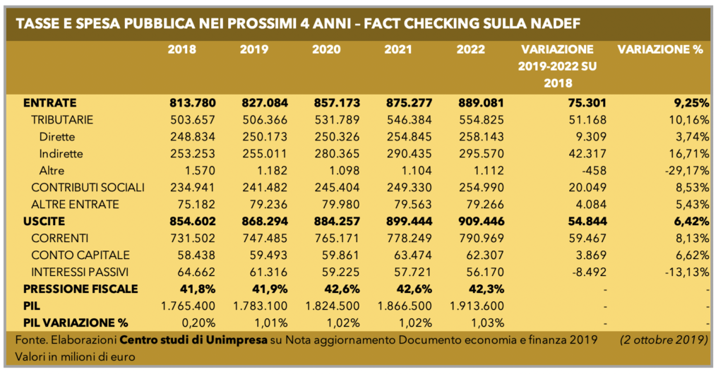Nei prossimi 4 anni le tasse e i contributi previdenziali cresceranno di 75,3 miliardi; “dagli 813 miliardi del 2018, quest’anno si arriverà a 827 miliardi per poi salire progressivamente fino agli 890 miliardi del 2022”, spiega Unimpresa. Il tutto “con una impennata complessiva del 9,25%”.