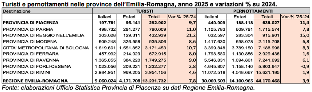 Il dinamismo piacentino emerge anche dal confronto con i dati dell’Emilia-Romagna. A livello regionale, gli arrivi sono cresciuti mediamente del 7,8%. Le presenze in regione hanno registrato un incremento più contenuto, pari al 3,9%. Piacenza, con un +11,4%, ha dunque fatto segnare un incremento di presenze quasi triplo rispetto alla media regionale. Le performance locali sono paragonabili così a quelle di province come Parma e Reggio Emilia. Con il territorio piacentino che si conferma un protagonista dell’Emilia occidentale.