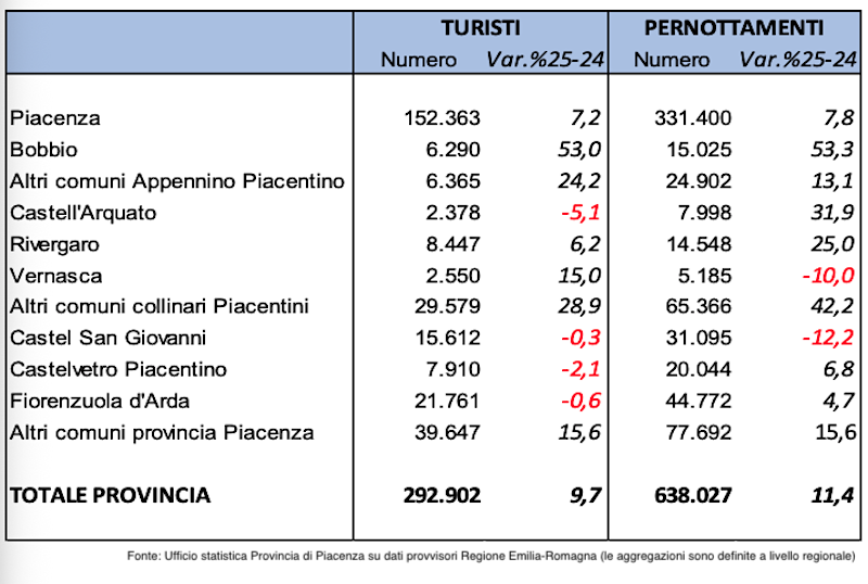 Bobbio si conferma al vertice della crescita turistica nel territorio provinciale. Il comune ha segnato un incremento record del 53,3% nelle presenze (oltre 15.000). Anche Castell’Arquato ha mostrato ottime performance sfiorando gli 8.000 pernottamenti (+31,9%). La stagionalità del turismo piacentino ha visto i suoi picchi nei mesi estivi: giugno, luglio e agosto hanno registrato incrementi tra il 18% e il 23%. Il secondo semestre 2025 è stato dunque particolarmente brillante per l’intera provincia, con il sistema turistico locale che sembra aver trovato una via di crescita.